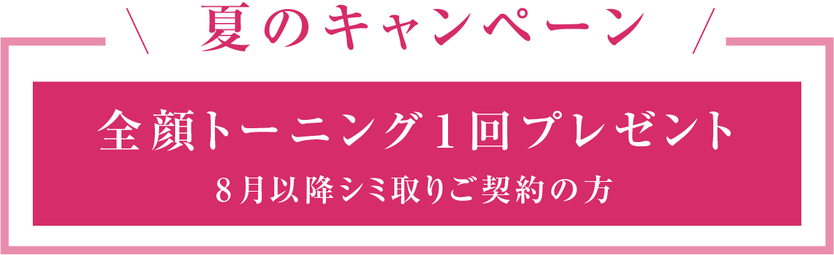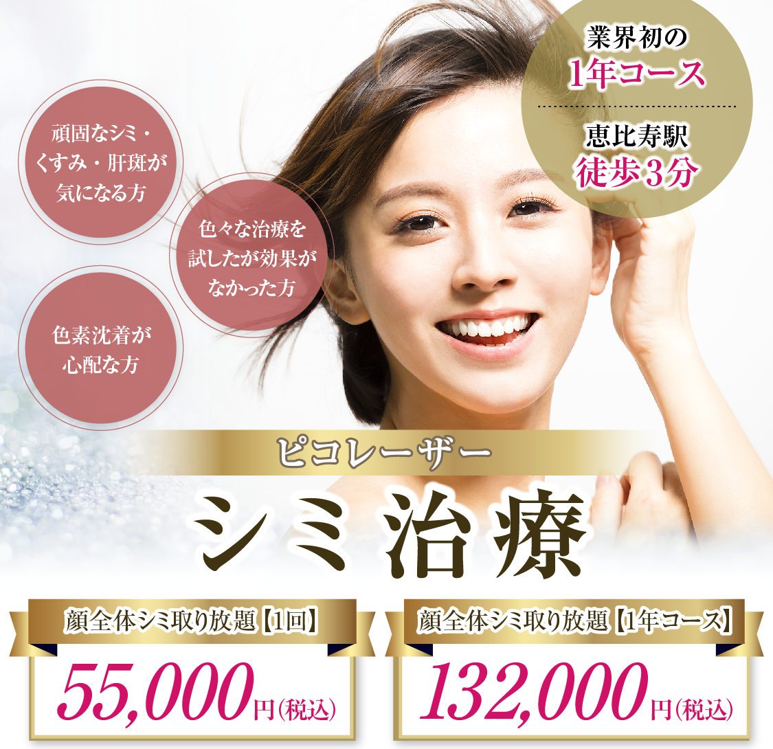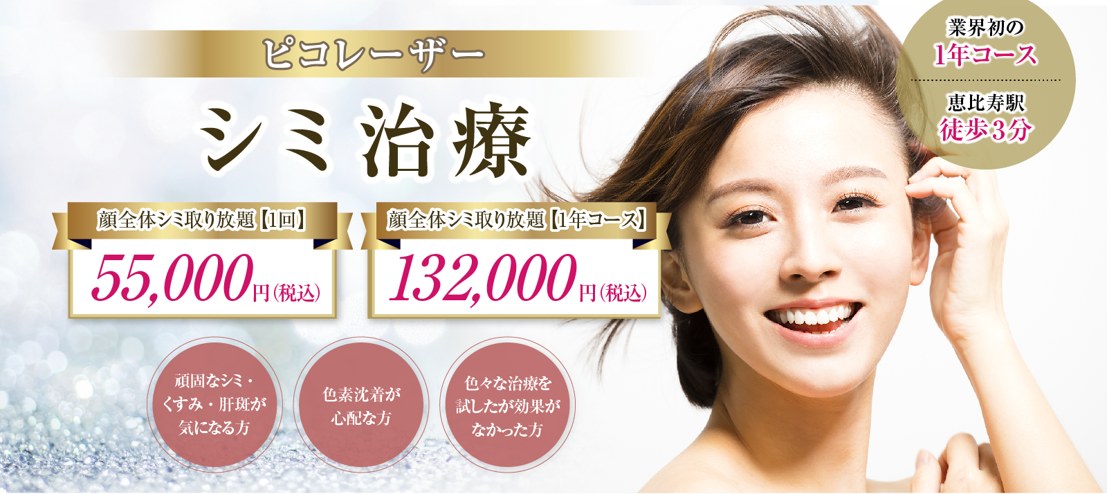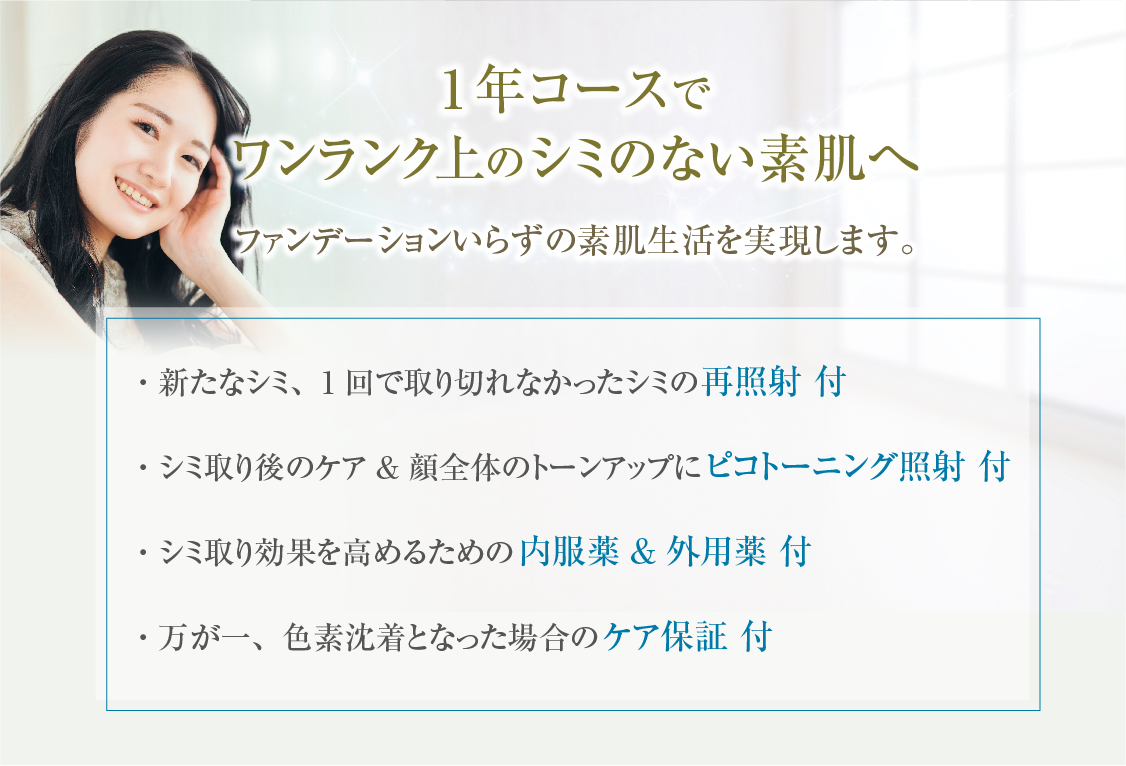 コース契約でお悩みのシミを全て解決 ご納得頂けるまでの患者様一人一人にあわせた治療プランをカスタマイズ シミ取り放題のため、追加料金なし 業界初の1年コース治療